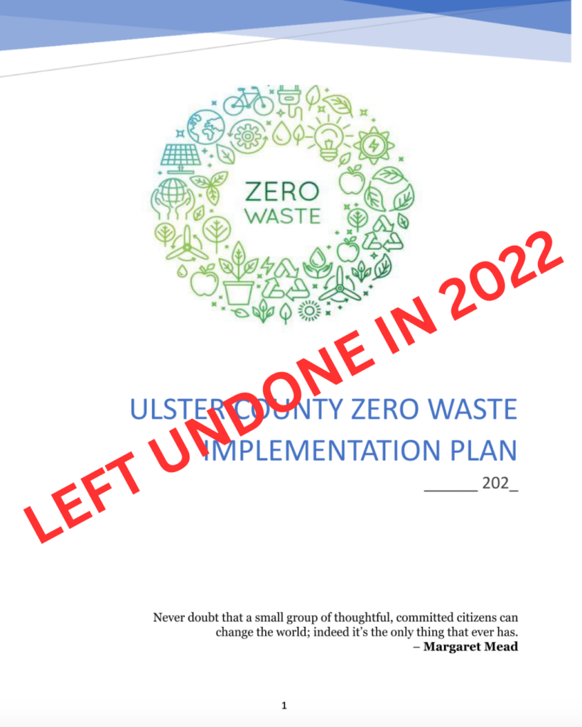 Seven years after the Ulster County Legislature (UCL) passed Resolution 451, establishing a policy to become a Zero Waste Community, the legislature and Ulster County Resource Recovery Agency (UCRRA) has yet to complete a Zero Waste Implementation Plan (ZWIP). Instead, lacking political will and sufficient funding, it continues to redefine the process and kick the can down the road instead. At a time when we have no time to waste.
