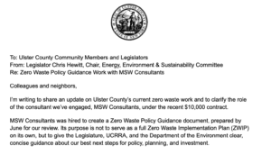 In an effort to expand public participation in Ulster County’s Zero Waste planning process, we recently called on members of the Ulster County Legislature’s Energy, Environment and Sustainability Committee to ensure that meaningful opportunities for public comment are built into MSW consultants’ work on the County’s Zero Waste Policy Guidance document before it is finalized.