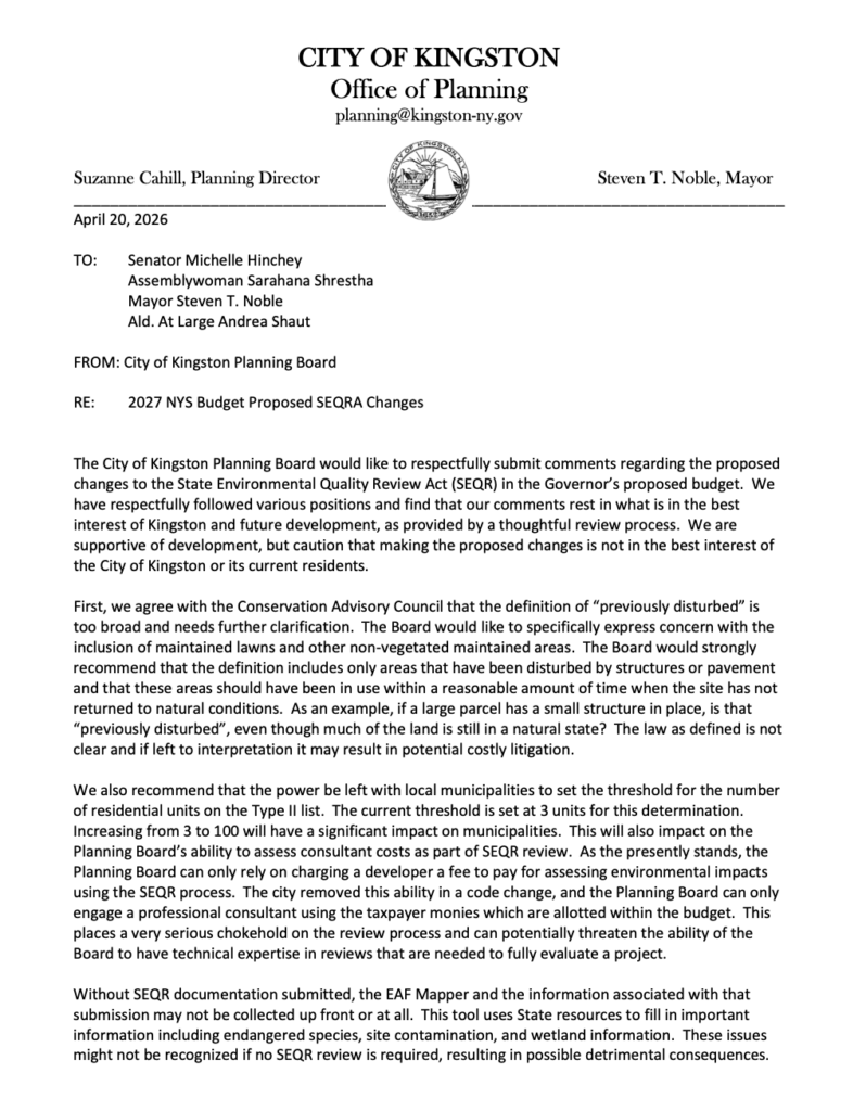 The Kingston Planning Board has formally weighed in on the Governor’s proposed changes to the State Environmental Quality Review Act (SEQR), warning that, as written, the changes could undermine thoughtful, responsible development in Kingston. Their letter adds to a growing and aligned chorus that includes the Kingston Common Council and the Kingston Conservation Advisory Council (CAC).